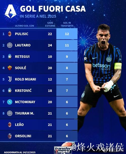 意甲2024-25赛季进入收官阶段,本赛季的客场进球榜单在近日出炉,其中美国球星克里斯蒂安·普利希奇以12粒客场进球领跑全联盟,国际米兰前锋劳塔罗·马丁内斯则以11球紧随其后,位列第二。这份榜单不仅折